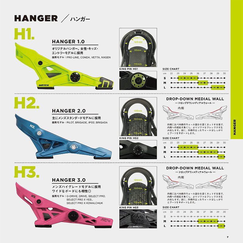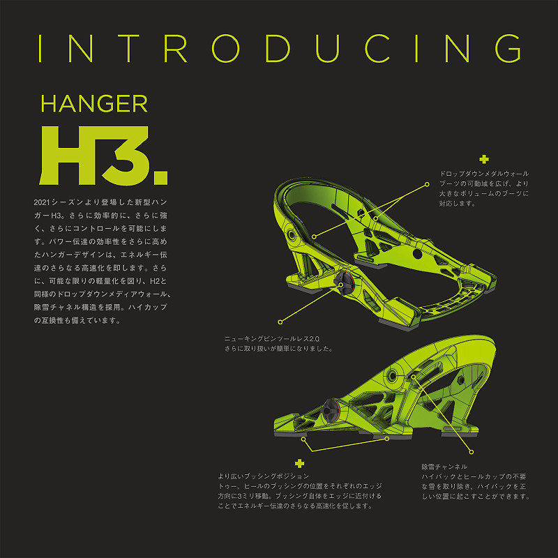 NOWでは、「ハンガー」と呼ばれるパーツがあります。 ハンガーはSKATETECHを生み出すフレームデザインの総称です。フレームデザインであるハンガーは3種類あります。 NOWがブランドスタートするまでに約10年の歳月をかけて完成させてオリジナルデザイン・ハンガー1.0,その後、ヒール幅を5mm広げ、各ディテールをアップデートしたハンガー2.0、そして2021年、SKATETECHのパワー伝達をさらに飛躍させた新デザインハンガー3.0です。各モデルにより採用されているハンガーが異なります。